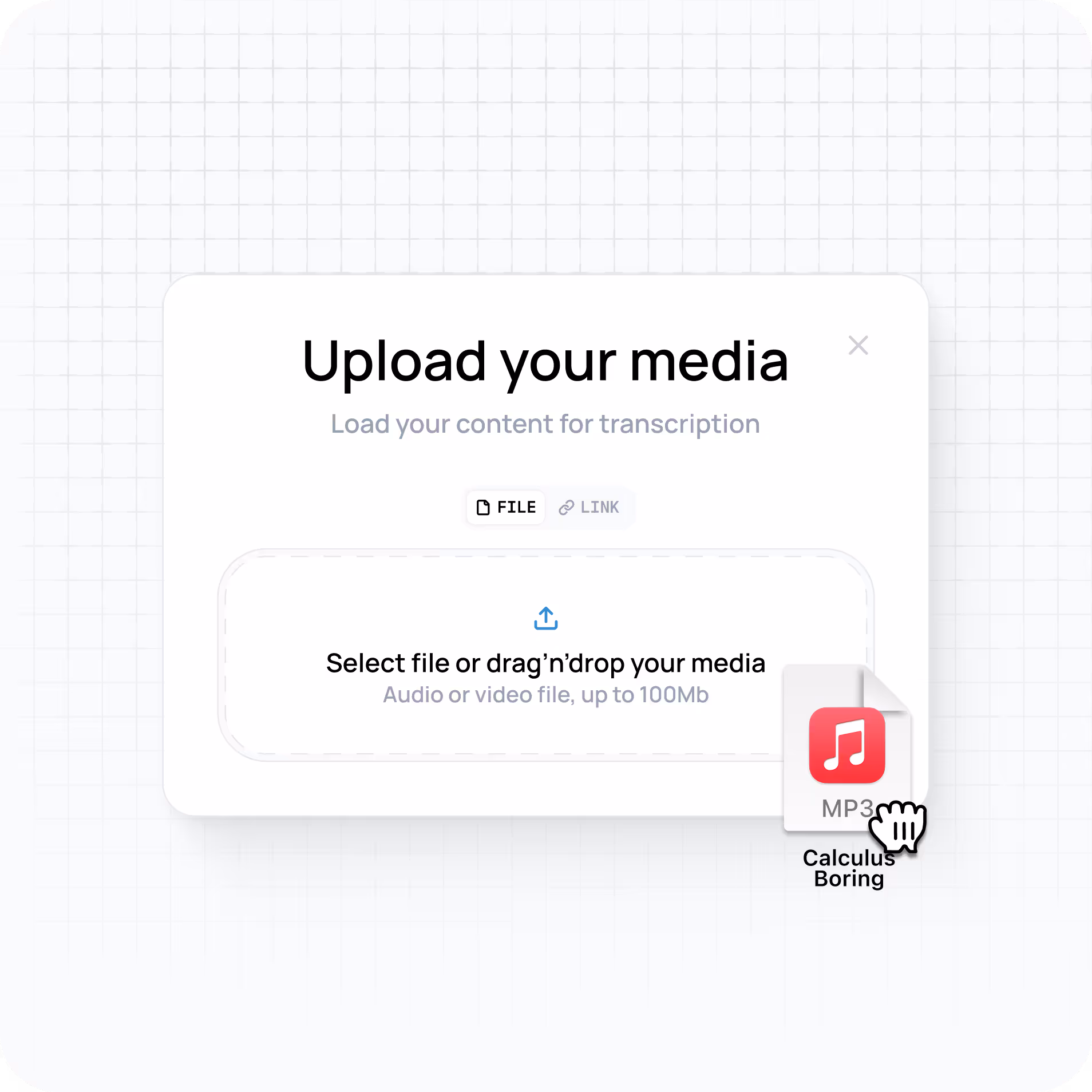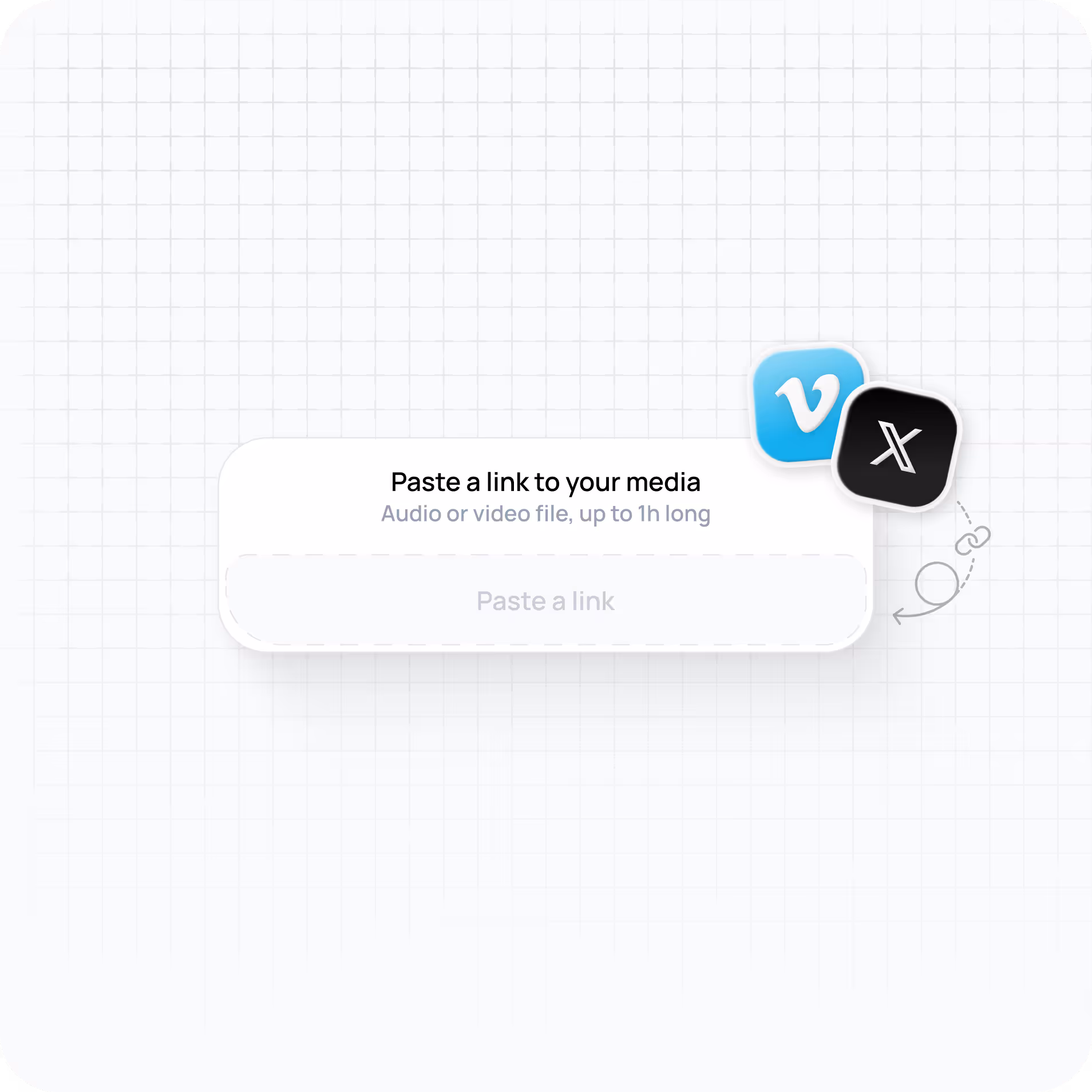 We support most popular audio and video formats, including MP3, MP4, WAV, WEBM, M4A, AVI, and MOV. You can also transcribe video links from YouTube, Instagram, VK, Facebook, Rutube, Reddit, Twitter, Vimeo, and Google Drive, as well as online calls from Google Meet, Zoom, and Microsoft Teams.